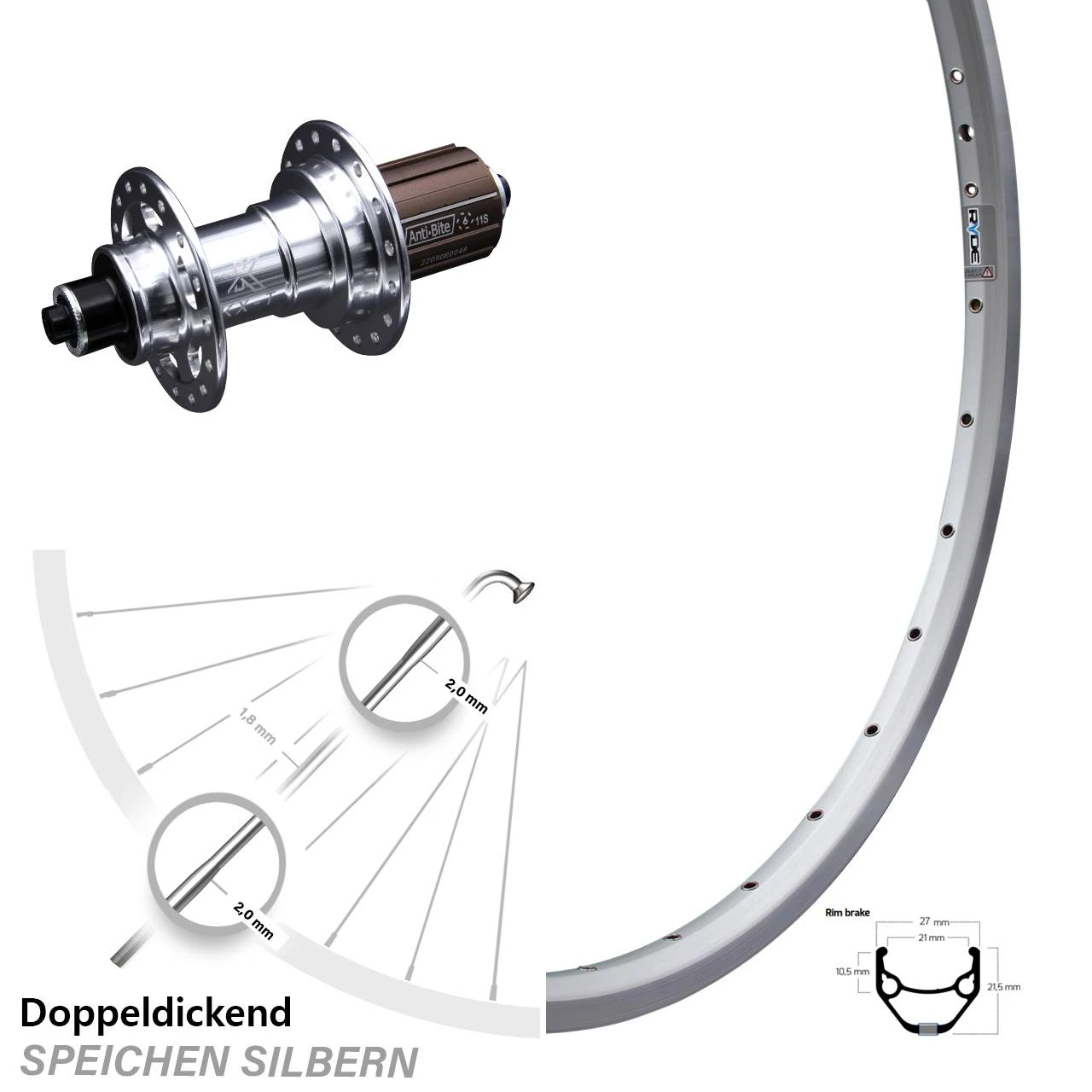 Technische Daten Hinterrad Ryde ZAC 421 Felgenbremse silbern und Nabe KX-T Hinterradnabe 5/130 Felgenbremse silbern