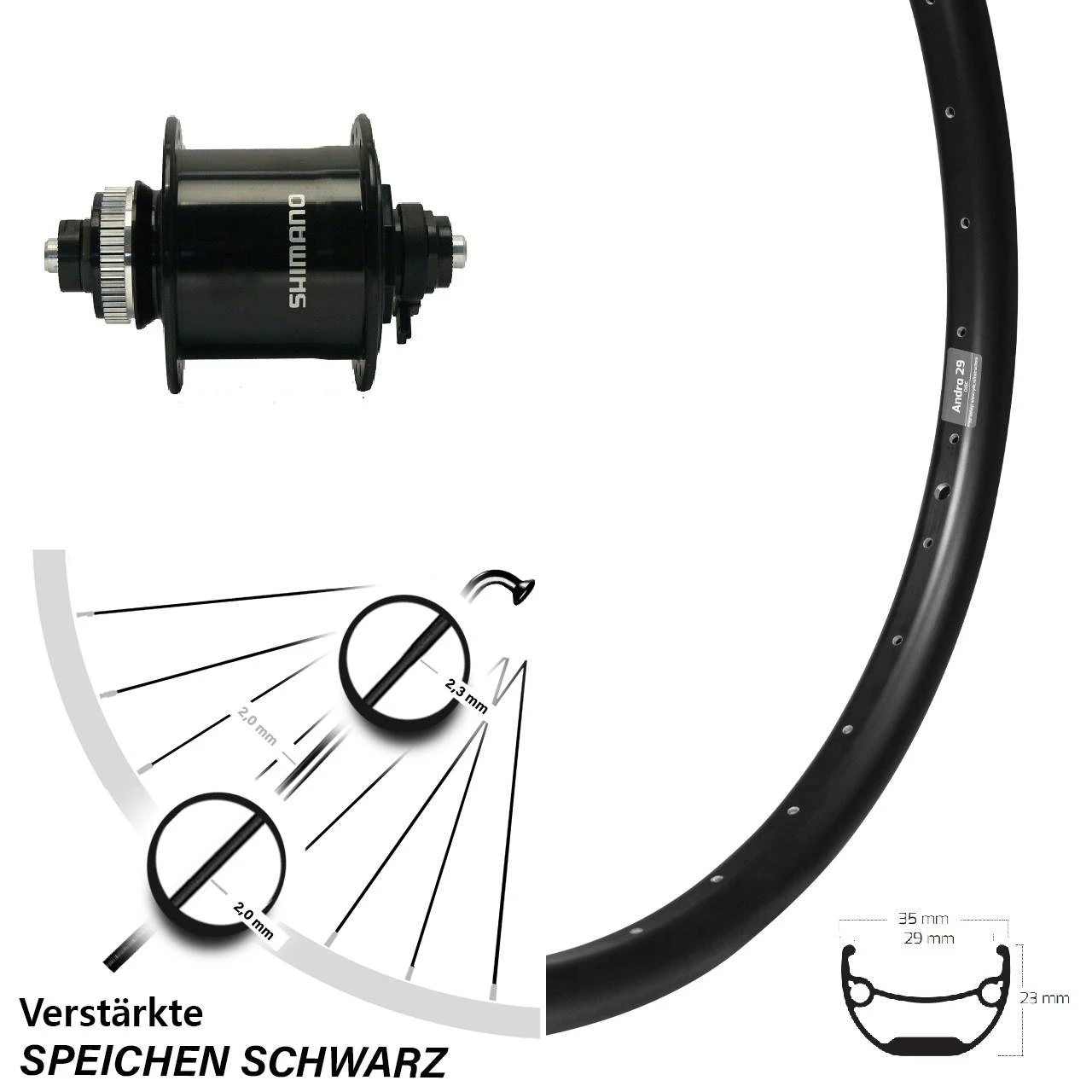 Technische Daten vorderes Laufrad Ryde Andra 29 Disc schwarz & Nabendynamo Shimano DH-UR700-3D schwarz
