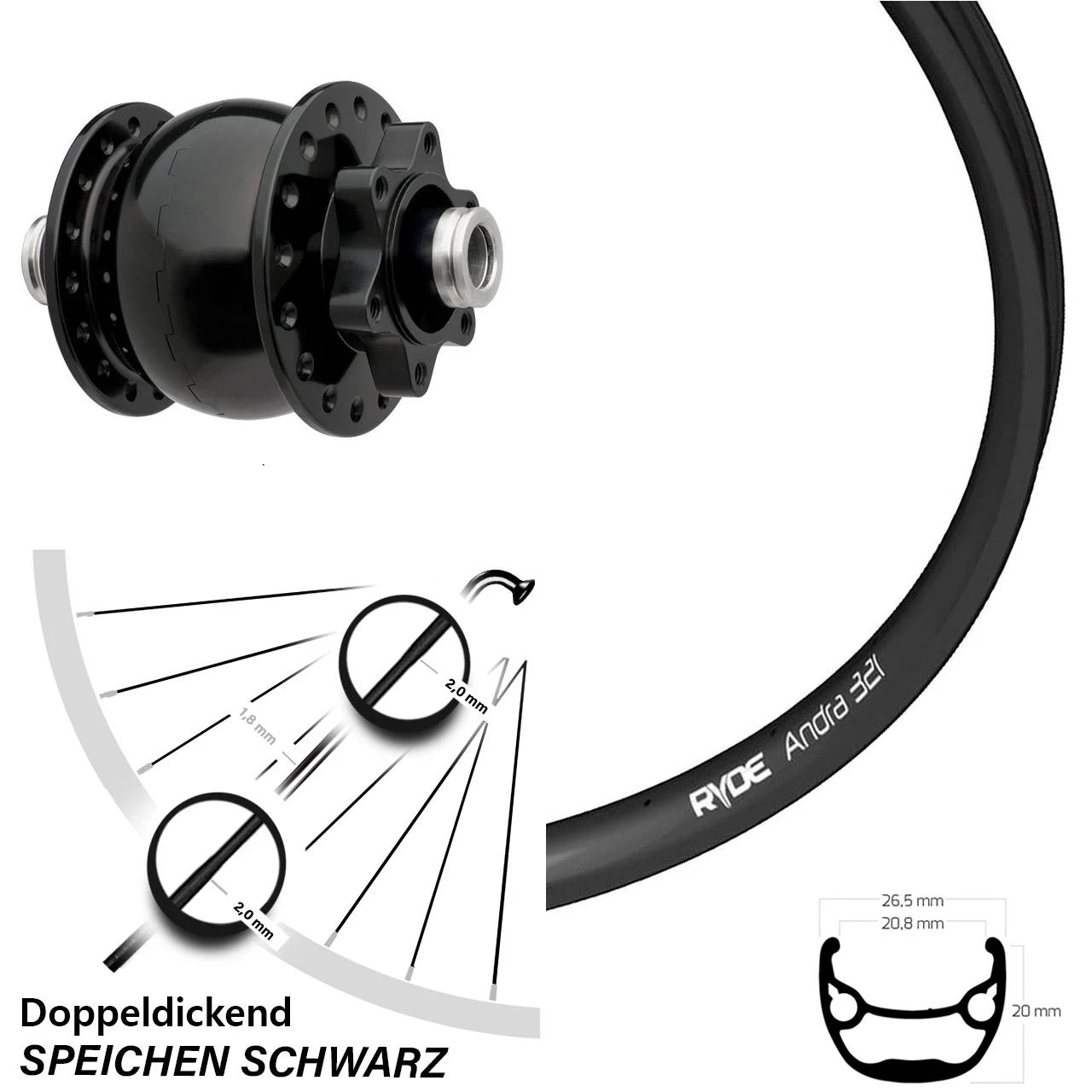 Technische Daten Vorderrad Ryde Andra 321 Disc schwarz & Nabendynamo SON 28-12 Disc 6-Loch schwarz