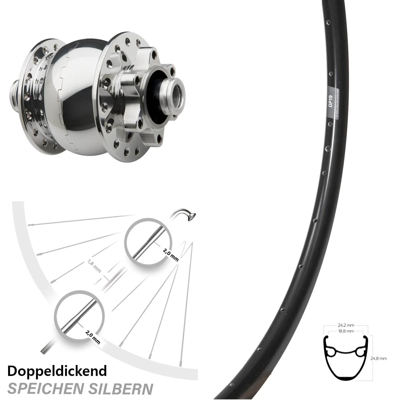 - Nabendynamo: SON 28-12 Disc 6-Loch silbern – besonders leichtläufig