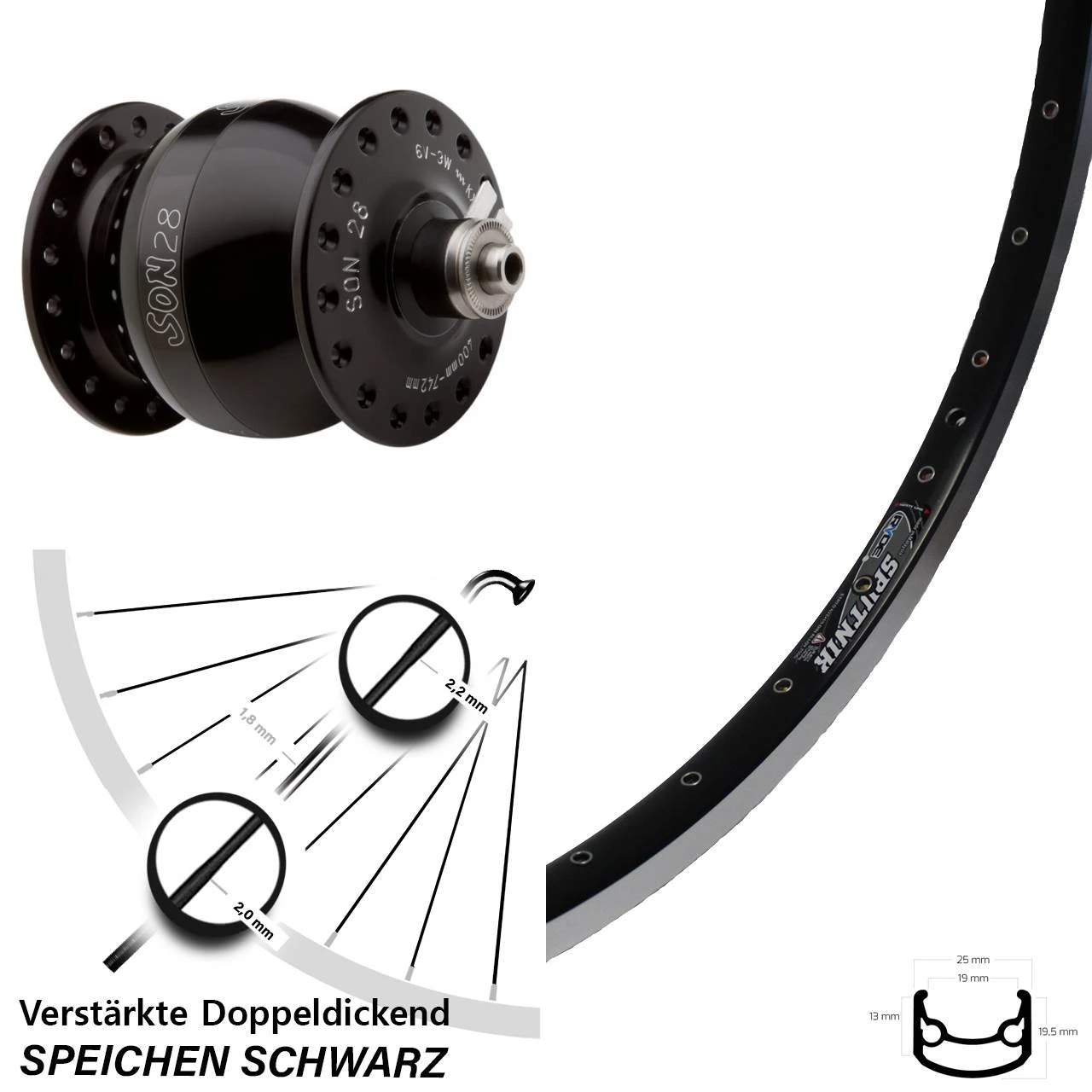 28 Zoll Vorderrad Fahrrad Ryde Sputnik schwarz Son Nabendynamo mit verstärkten Doppeldickendspeichen