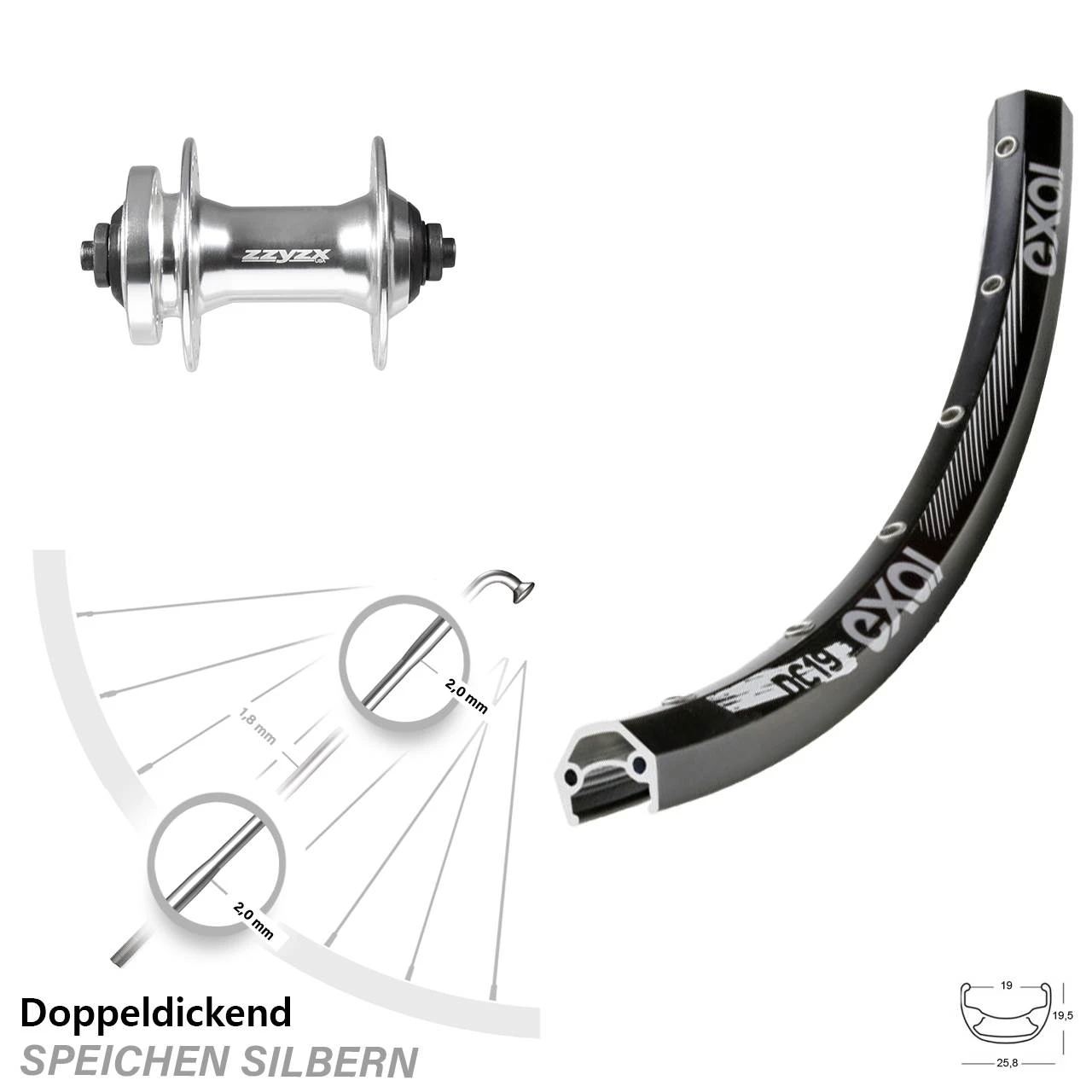 Technische Daten Vorderrad Exal DC 19 schwarz mit Nabe Formula ZZYZX DC-21 silbern