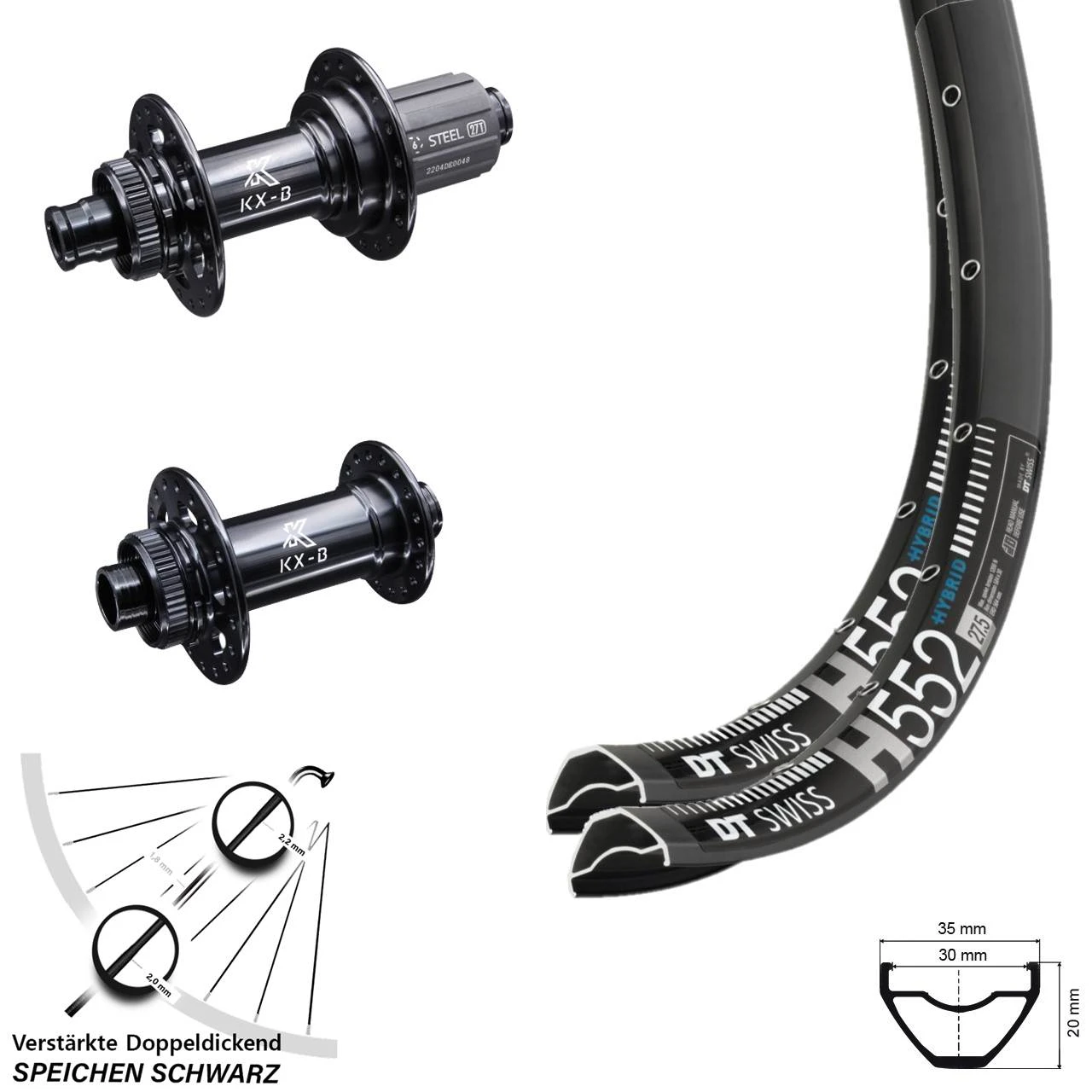 - 1 verstärktes 27,5 Zoll Hinterrad DT Swiss H 552 mit KX-B Boost Centerlock 11-fach E-Bike (Auswahl zwischen Messingnippel schwarz, Messingnippel silbern)