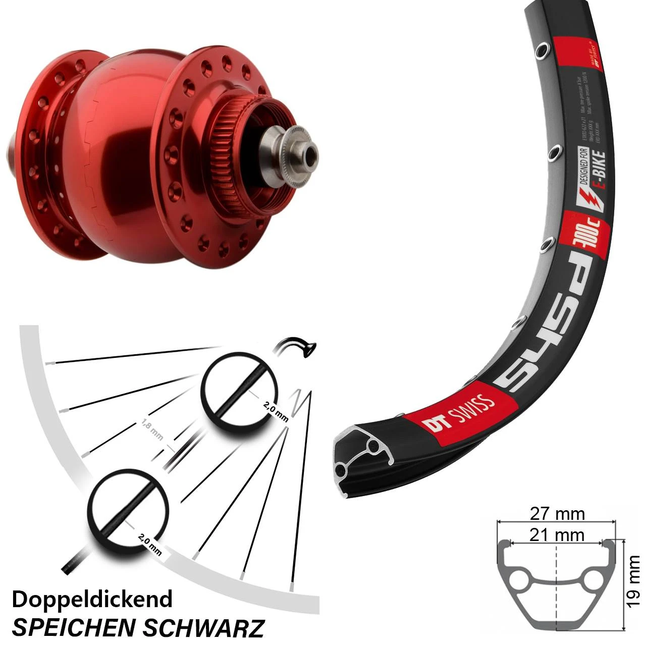 - Vorderrad 28 Zoll, 29 Zoll DT Swiss 545 schwarz mit Nabendynamo SON 28 rot
