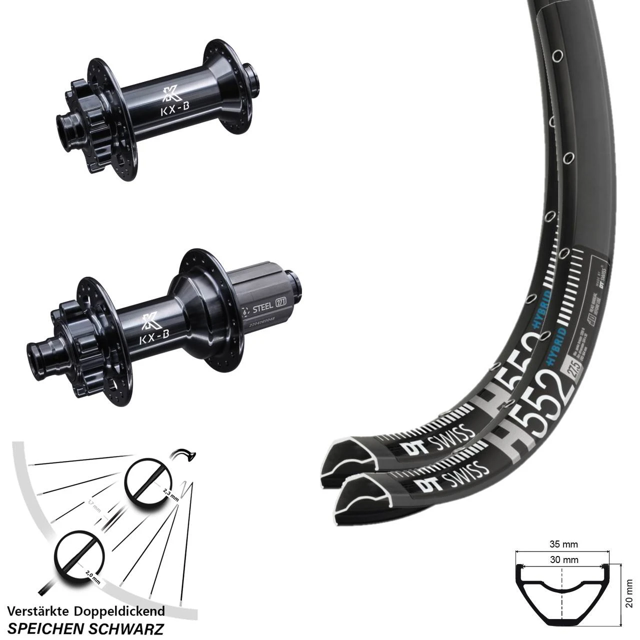 - 1 verstärktes 27,5 Zoll Hinterrad DT Swiss H 552 mit KX-B Nabe 11-fach 12×148 mm Boost 6-Loch (Auswahl zwischen Messingnippel schwarz, Messingnippel silbern)