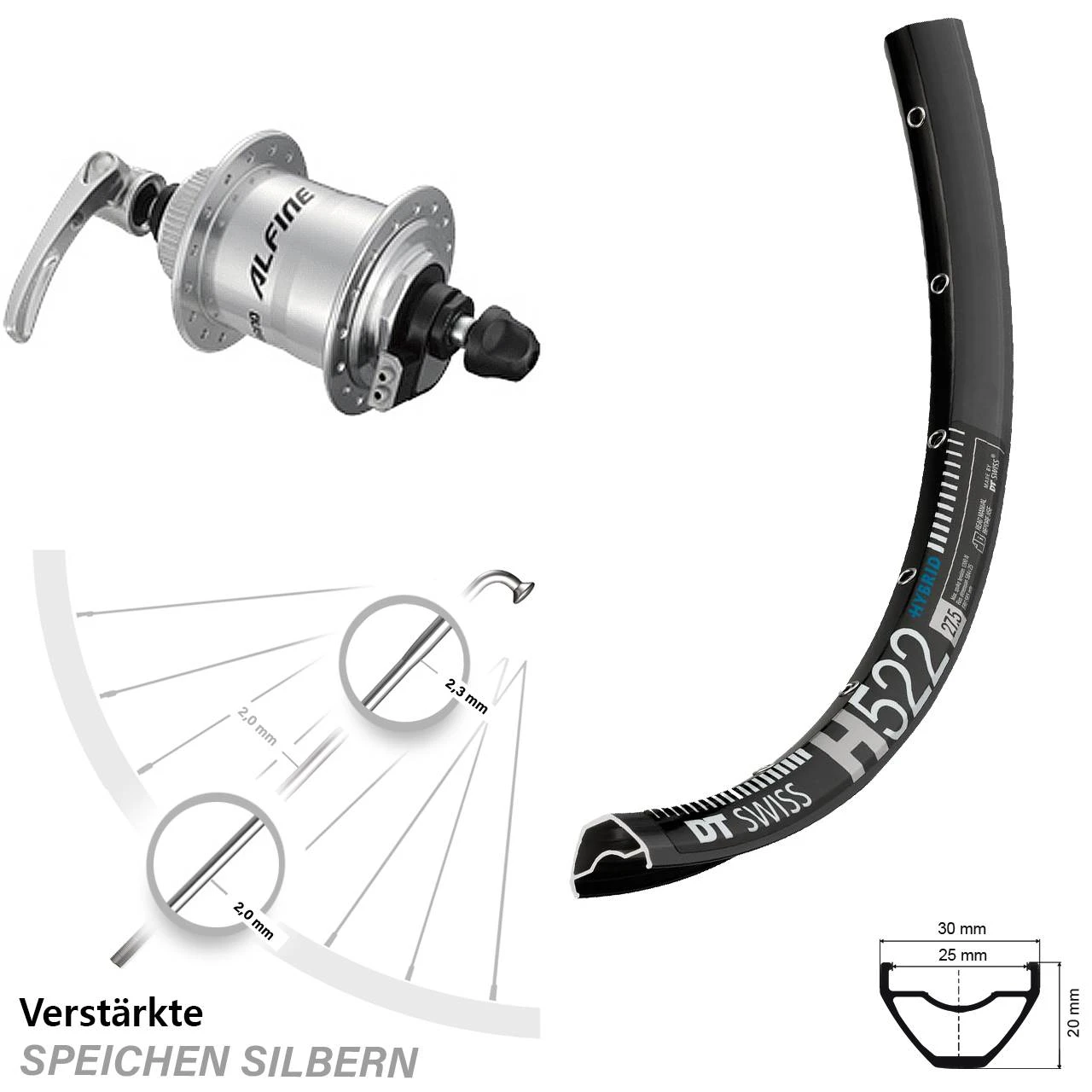 - Vorderrad 29 Zoll DT Swiss H 522 schwarz mit Nabendynamo Shimano Alfine DH-S701 silbern