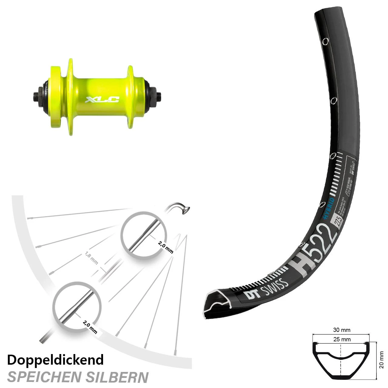 Technische Daten Vorderrad DT Swiss H 522 Disc schwarz mit Nabe XLC VR Disc grün