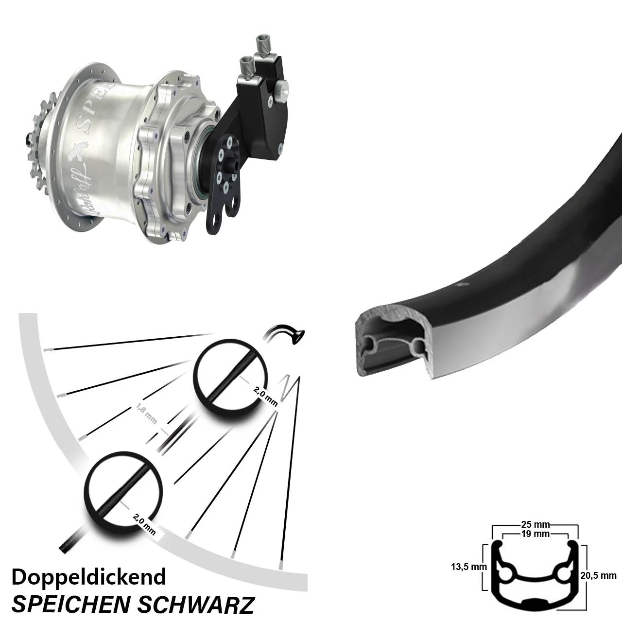 Speichen: Diese Doppeldickendspeiche aus rostfreiem und hochwertigen Edelstahl vom Markenhersteller Sapim aus Belgien ist eine besonders leichte Speiche. Sie ist speziell für leichte Laufräder geeignet. Sapim hat hier einen guten Kompromiss zwischen Gewicht und Stabilität gefunden. Diese leichte Doppeldickendspeiche ist im besonders bruchgefährdeten Bereich der Nabe und am Gewindeende mit 2,0 mm besonders stark ausgeführt. Im Mittelteil weist sie „schlanke“ 1,8 mm auf, was Gewicht spart. Zudem fängt die Speiche dank ihrer guten Elastizität und der hohen Festigkeit am Mittelteil mit 1300 N/mm2 auch hohe Zug- und Druckkräfte hervorragend ab. Die endverstärkte Edelstahl-Speiche mit einem Durchmesser von 2,0 mm, 1,8 mm und 2,0 mm kommt beim Rennrad und MTB/Mountainbike zum Einsatz.