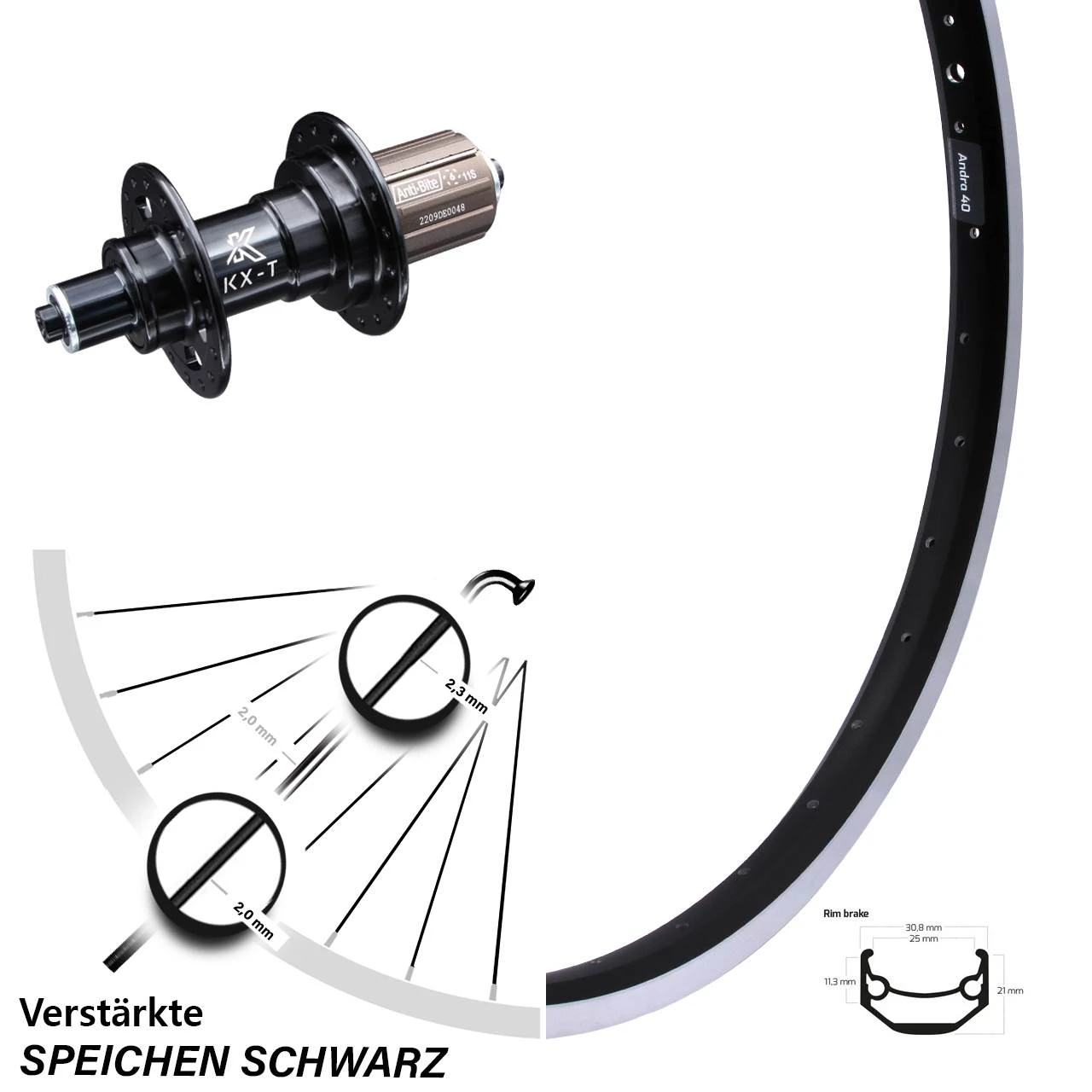 Technische Daten Hinterrad Ryde Andra 40 Felgenbremse schwarz und Nabe KX-T Hinterradnabe 5/135 Felgenbremse schwarz