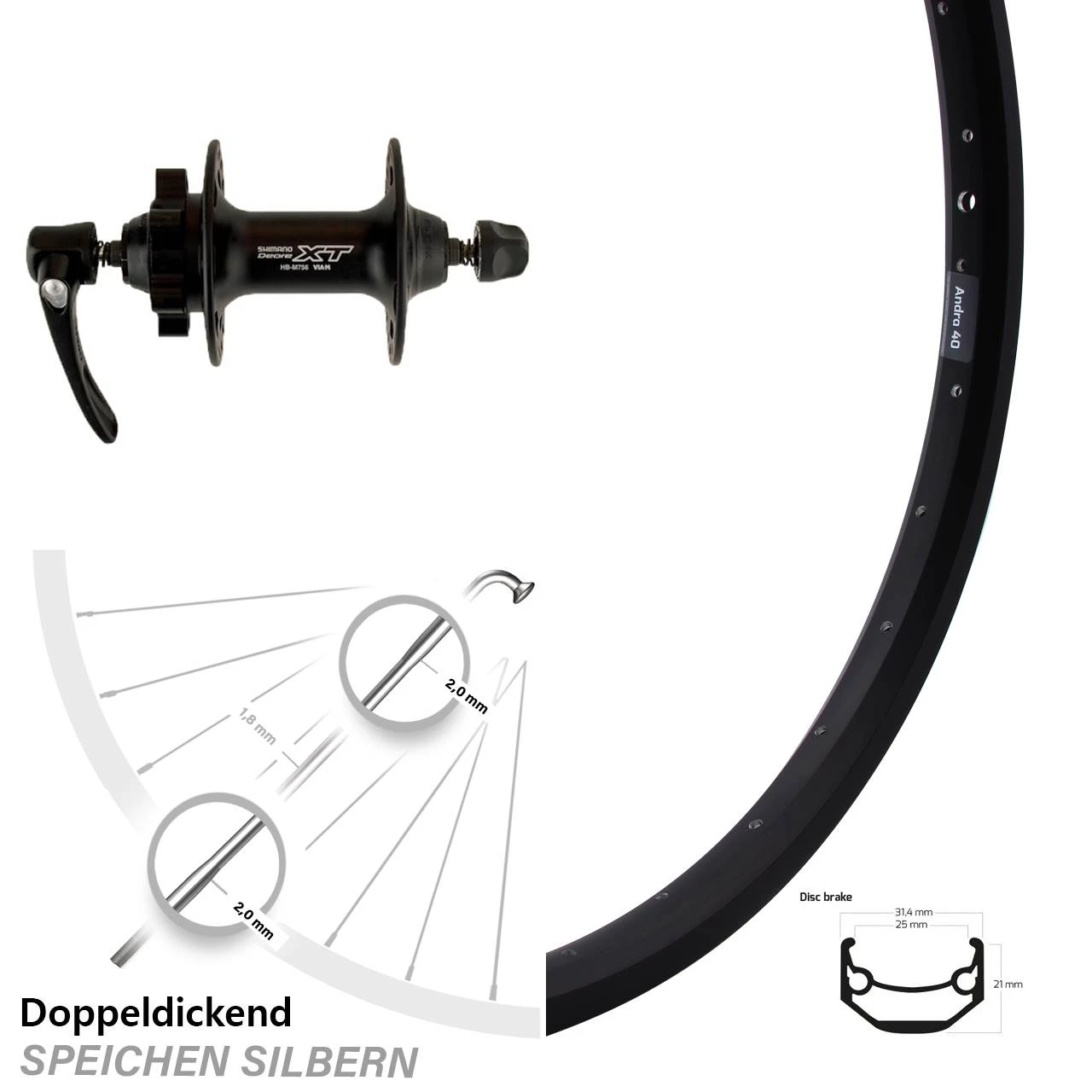 Technische Daten Vorderrad Ryde Andra 40 Disc schwarz mit Nabe Shimano XT HB-M756 schwarz