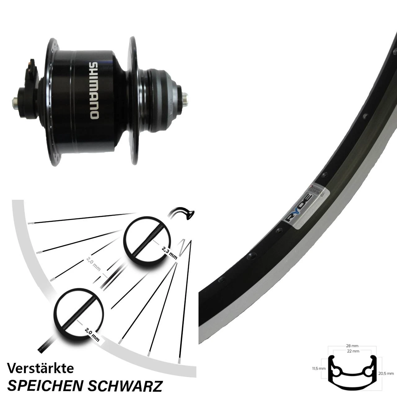 Technische Daten vorderes Laufrad Ryde Andra 35 Felgenbremse schwarz & Nabendynamo Shimano DH-3D72 schwarz