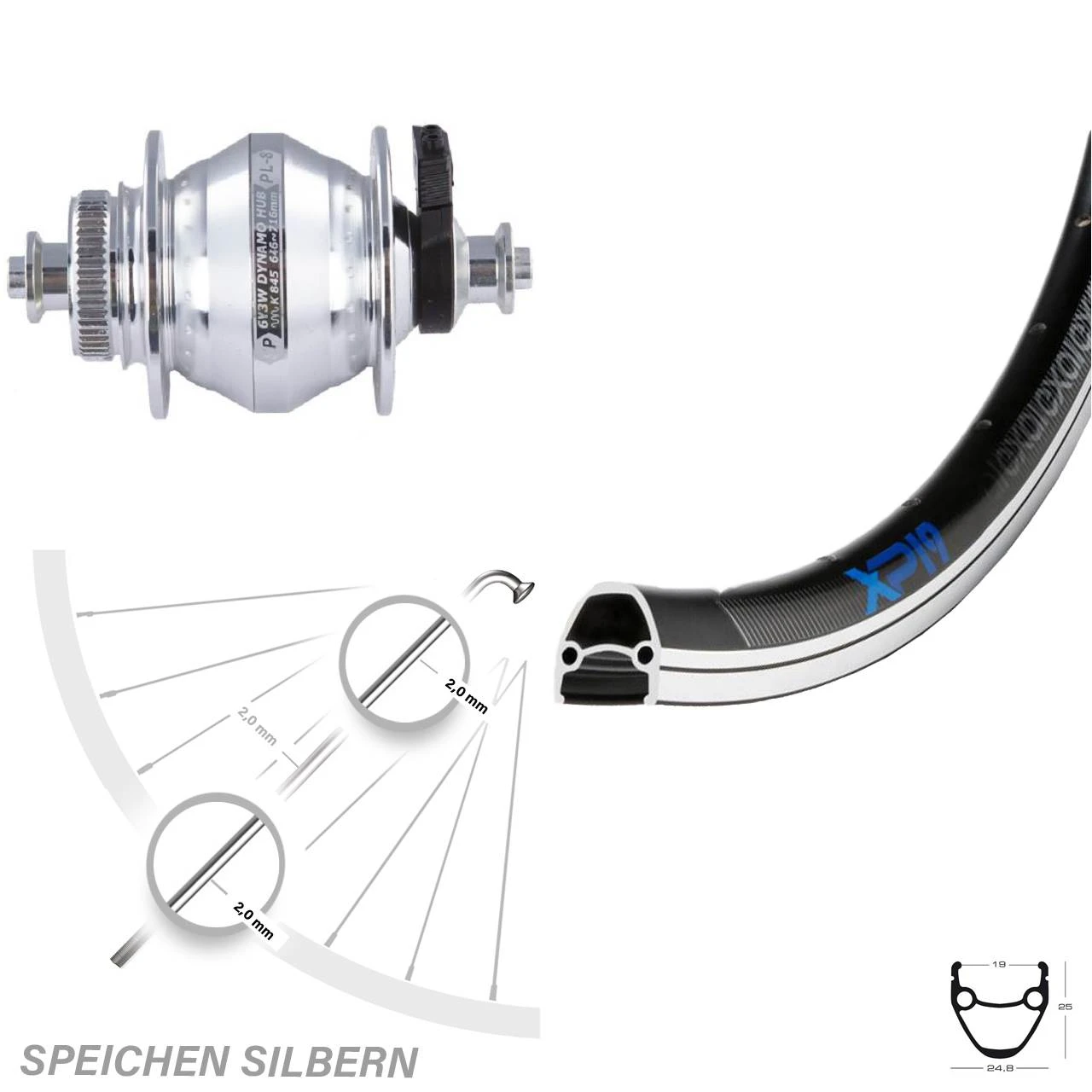 Technische Daten vorderes Laufrad Exal XP 19 schwarz & Nabendynamo Shutter Precision PL-8 Disc Centerlock silbern